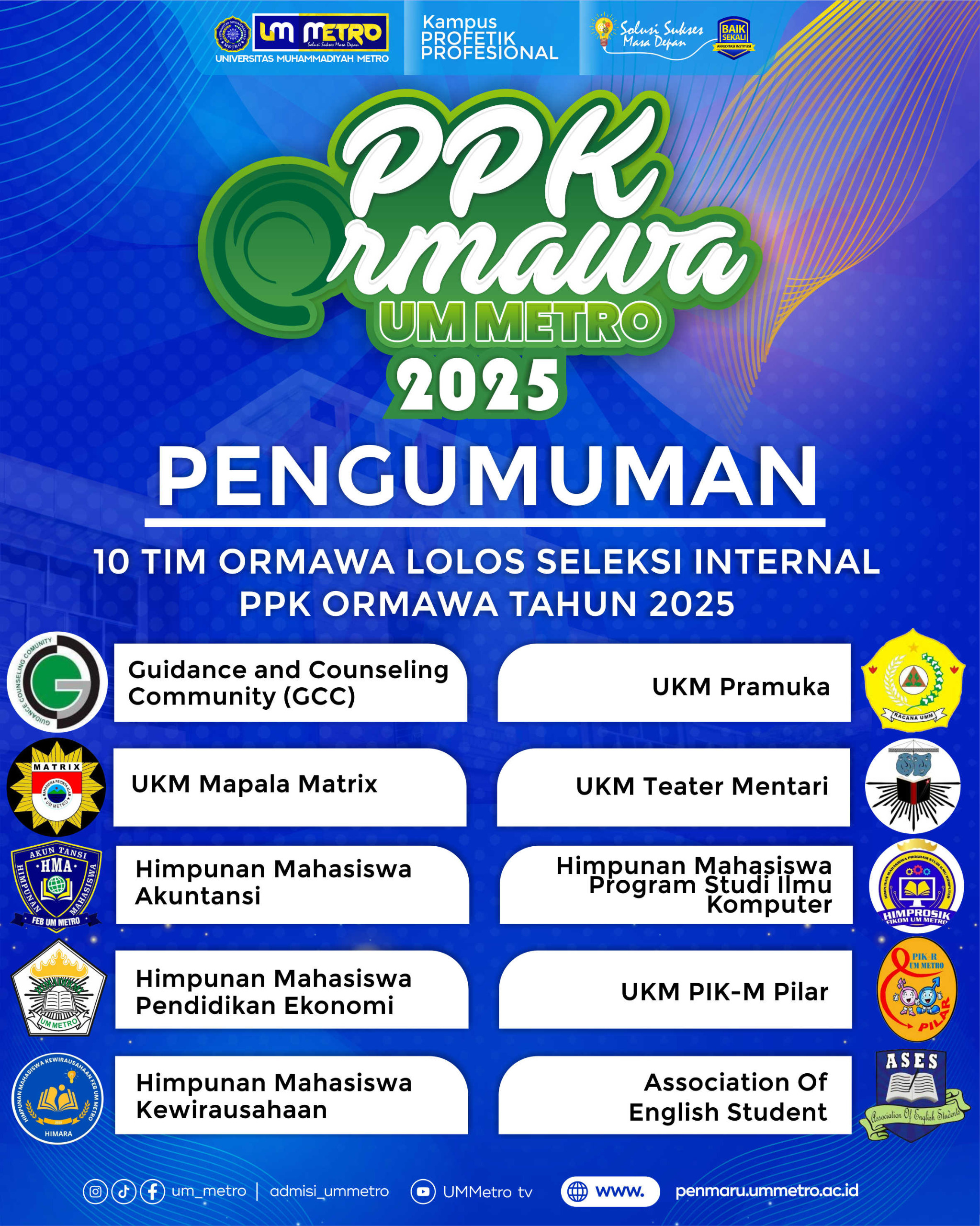 Metro, Lampung – Himpunan Mahasiswa Kewirausahaan (Himara) dari Program Studi S1 Kewirausahaan FEB Universitas Muhammadiyah Metro (UMM) berhasil menorehkan prestasi gemilang dengan lolos seleksi internal Program Penguatan Kapasitas Organisasi Kemahasiswaan (PPK Ormawa) tahun 2025 (29/05/2025). Proposal yang diketuai oleh Gilang Juan Wilyardana ini akan melaju ke tahap seleksi nasional yang diselenggarakan oleh Direktorat Pembelajaran dan Kemahasiswaan (Belmawa), Direktorat Jenderal Pendidikan Tinggi, Riset, dan Teknologi.